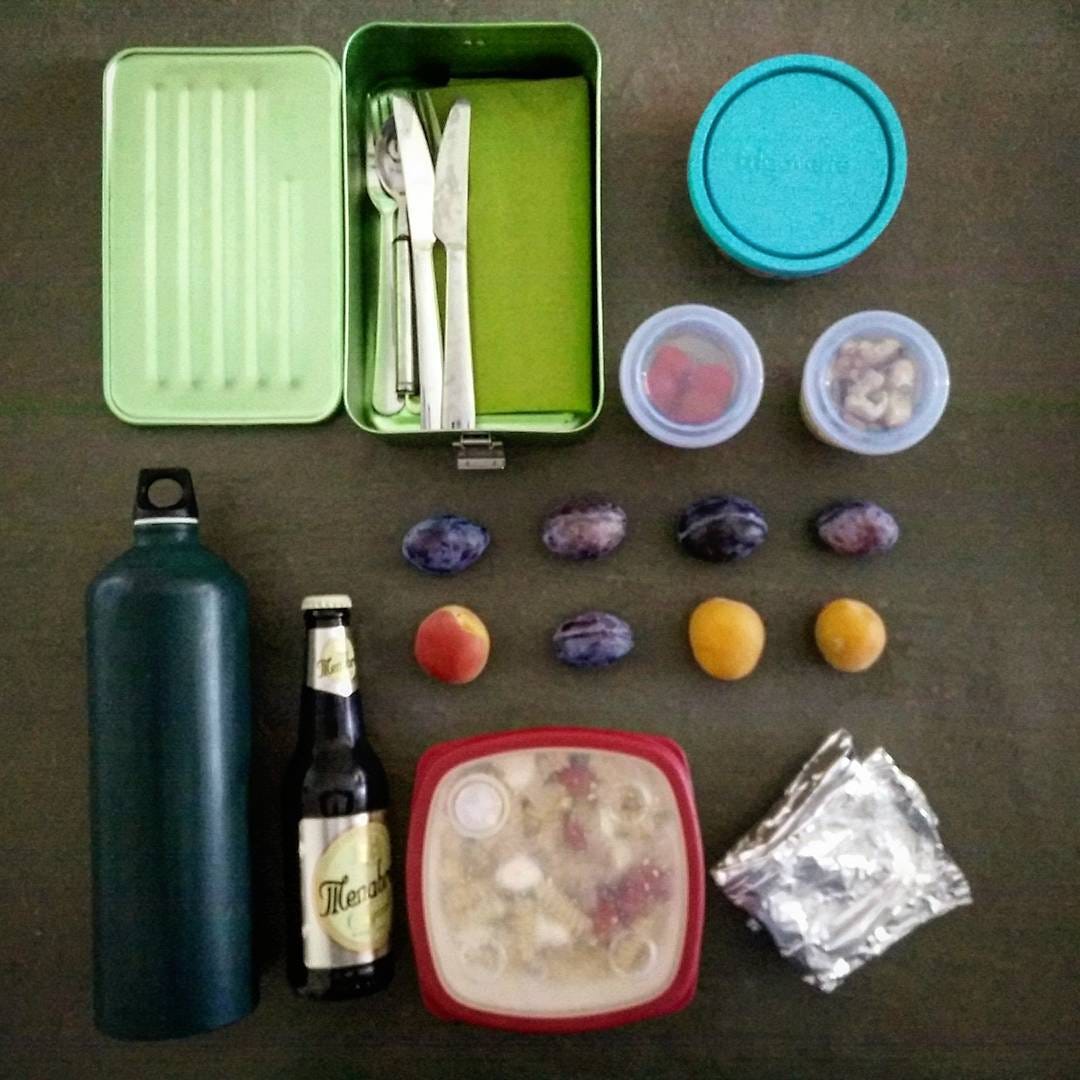 Una volta arrivati, dopo una passeggiata di dieci minuti, abbiamo guadagnato un posto all’ombra, steso la coperta e iniziato a mangiare. A mano a mano che terminavamo le portate, sistemavo le vaschette, in modo da non perdere nulla e avere tutto in ordine da subito. In questi casi io stesso mi chiedo cosa potrebbe succedere se lasciassi i contenitori ribaltati in malo modo sull’erba, recuperandoli dopo.